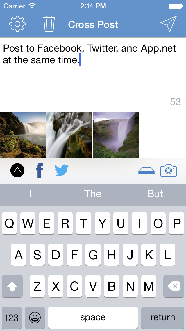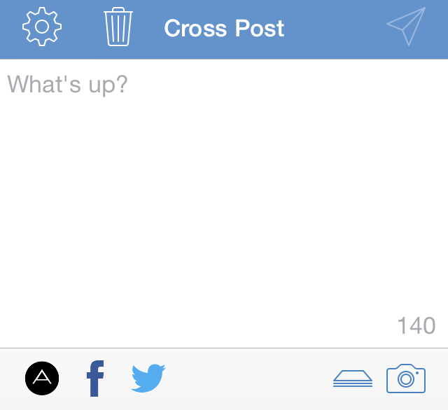 Cross Post is the fastest way to share what's on your mind to Facebook, Twitter, and App.net. Write your post, add photos if you wish, and send. Cross Post does the rest.